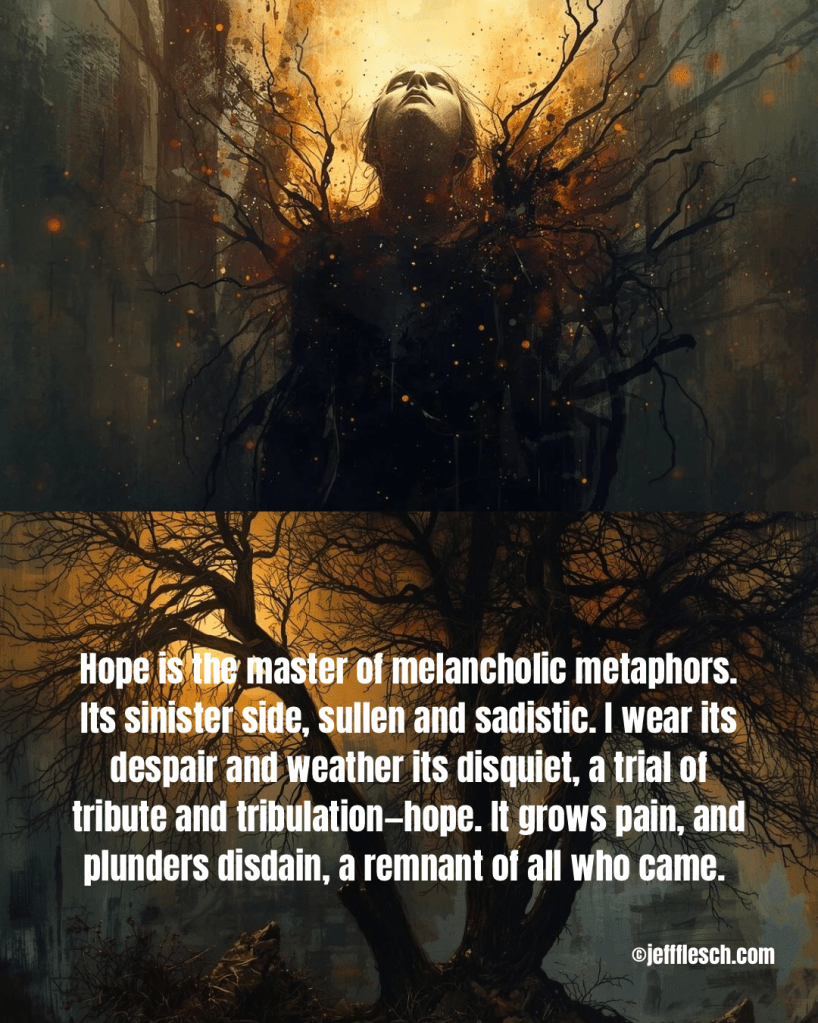 Hope is the master of melancholic metaphors. Its sinister side, sullen and sadistic. I wear its despair and weather its disquiet, a trial of tribute and tribulationโhope. It grows pain, and plunders disdain, a remnant of all who came.