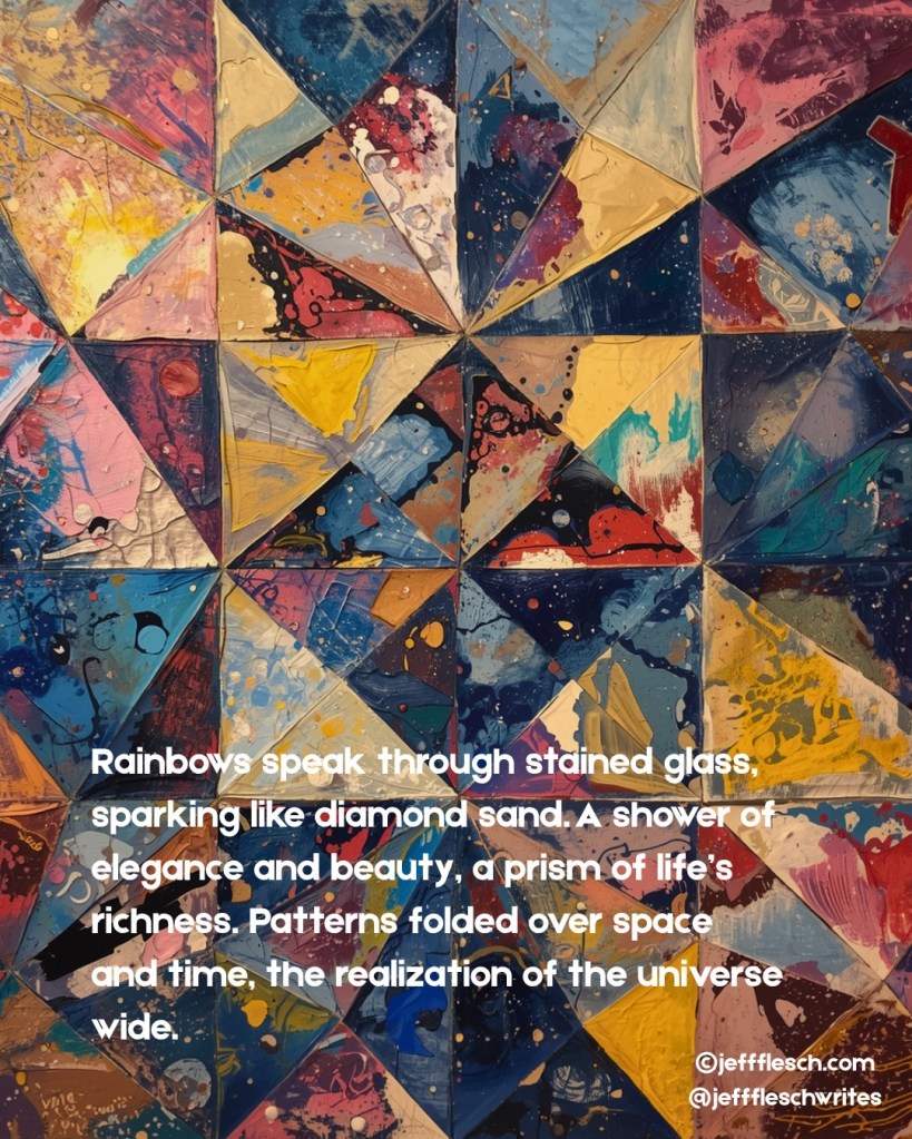 Rainbows speak through stained glass, sparking like diamond sand. A shower of elegance and beauty, a prism of lifeโs richness. Patterns folded over space and time, the realization of the universe wide.