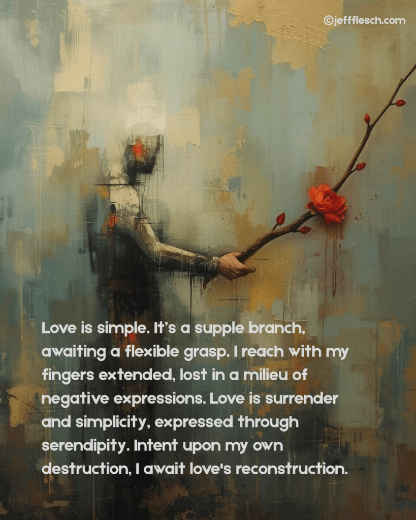 Love is simple. Itโs a supple branch, awaiting a flexible grasp. I reach with my fingers extended, lost in a milieu of negative expressions. Love is surrender and simplicity, expressed through serendipity. Intent upon my own destruction, I await loveโs reconstruction.ย