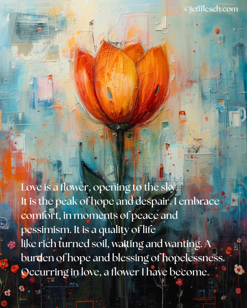Love is a flower, opening to the sky. It is the peak of hope and despair. I embrace comfort, in moments of peace and pessimism. It is a quality of life like rich turned soil, waiting and wanting. A burden of hope and blessing of hopelessness. Occurring in love, a flower I have become.ย