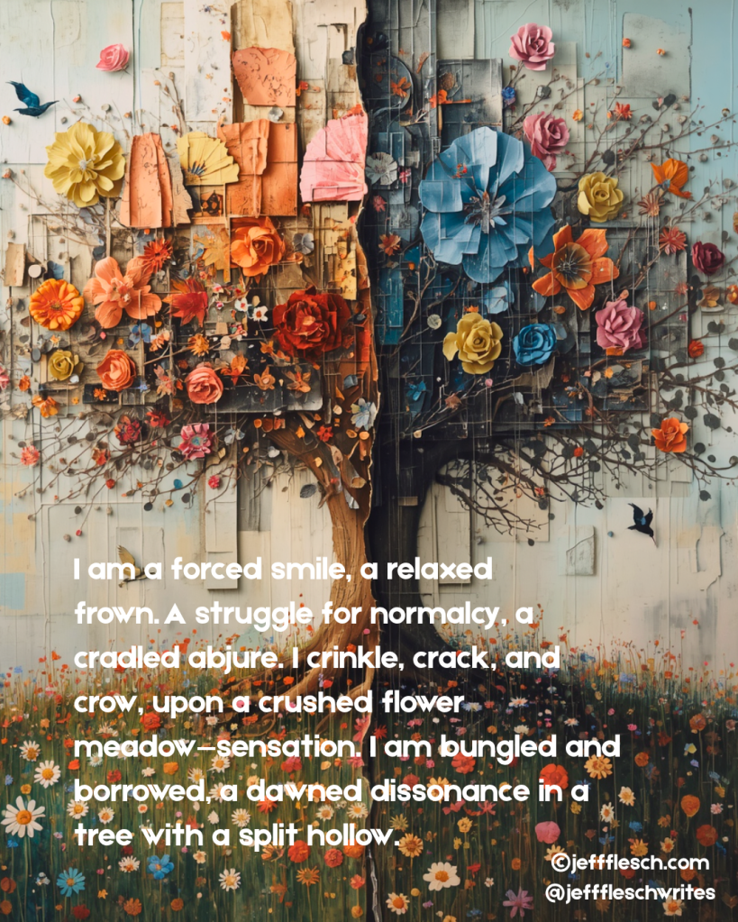 I am a forced smile, a relaxedย frown. A struggle for normalcy, a cradled abjure. I crinkle, crack, and crow, upon a crushed flower meadowโsensation. I am bungled and borrowed, a dawned dissonance in a tree with a split hollow.ย