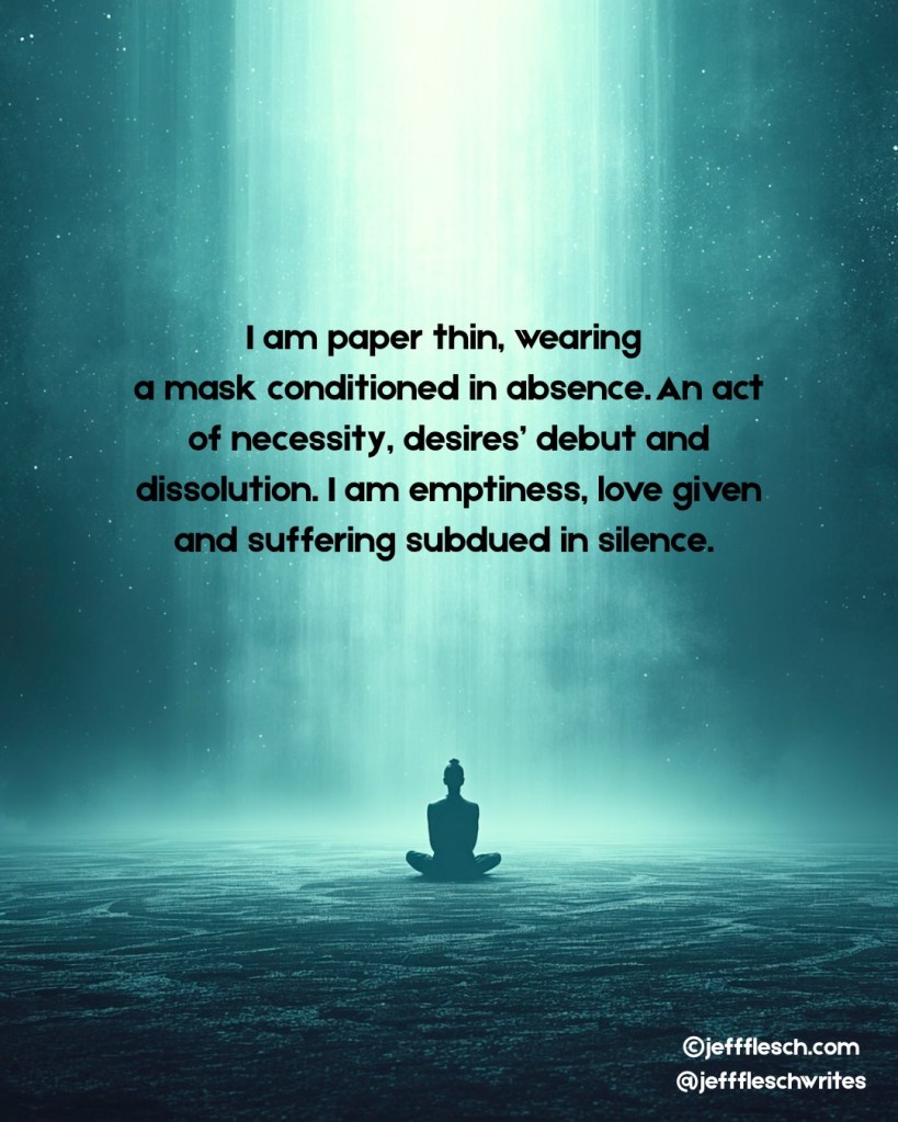 I am paper thin, wearingย a mask conditioned in absence. An act of necessity, desiresโ debut and dissolution. I am emptiness, love given and suffering subdued in silence.ย