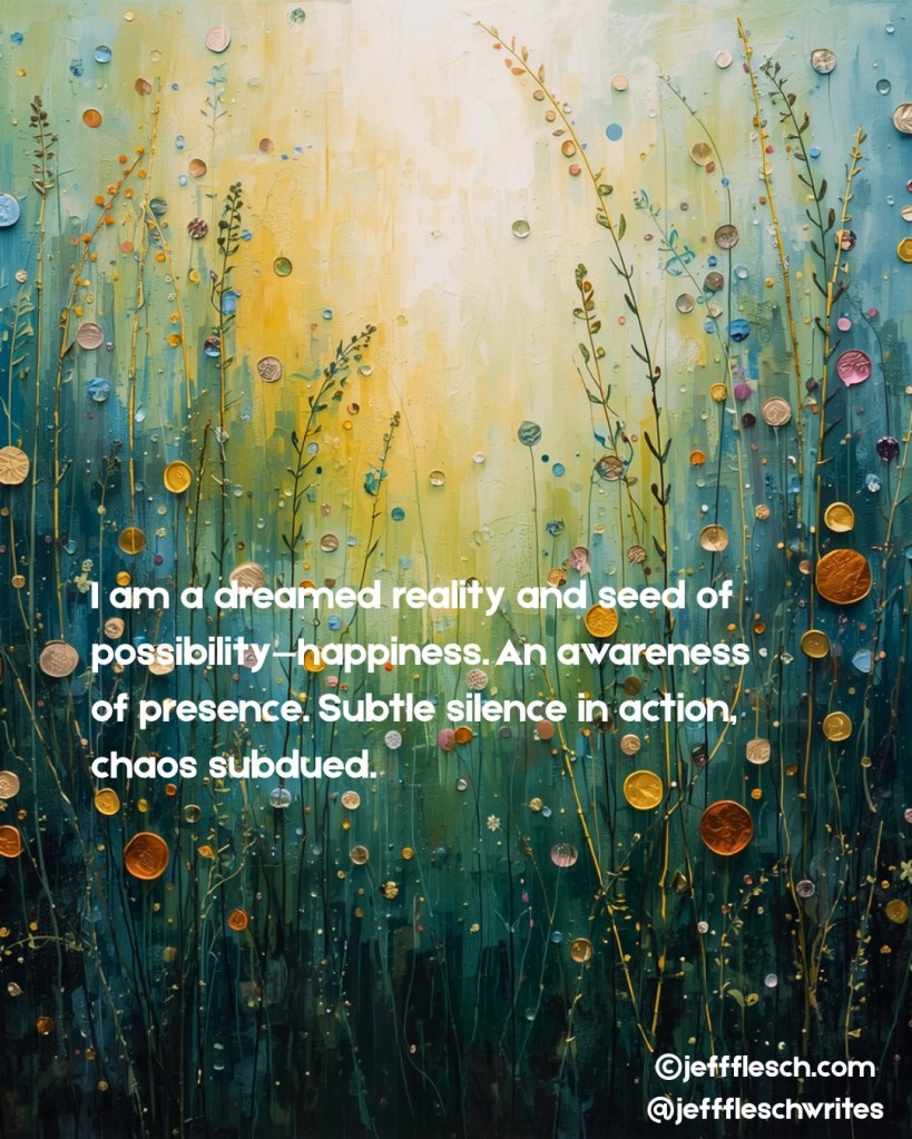 I am a dreamed reality and seed of possibilityโhappiness. An awareness of presence. Subtle silence in action, chaos subdued.ย