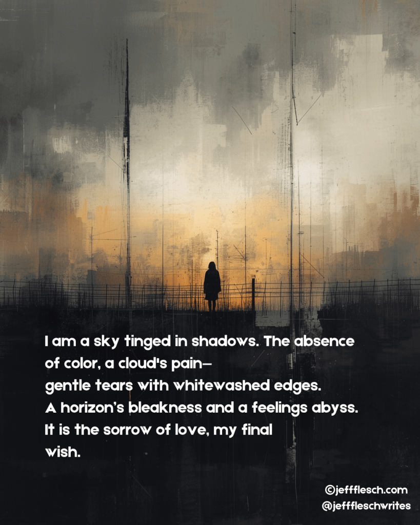 I am a sky tinged in shadows. The absence of color, a cloudโs painโ gentle tears with whitewashed edges.ย A horizonโs bleakness and a feelings abyss. It is the sorrow of love, my final wish.ย
