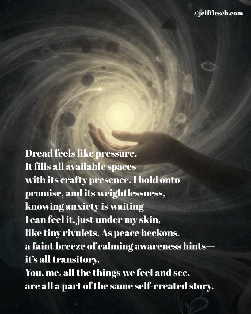 Dread feels like pressure. It fills all available spaces with its crafty presence. I hold onto promise, and its weightlessness, knowing anxiety is waitingโI can feel it just under my skin, like tiny rivulets. As peace beckons me, a faint breeze of calming awareness hintsโitโs all transitory. You, me, all the things we feel and see, are all a part of the same self-created story.ย
